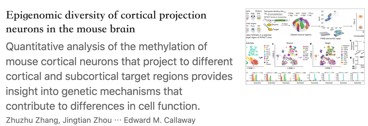 研究十:Epigenomic diversity of cortical projection neurons in the mouse brain。利用逆行标记和单个核DNA甲基化测序,检测了63个皮质-皮层、皮质-亚皮层远距离投射的11827个新皮层神经元,将分子特征与神经元的解剖和投射特性联系了起来。