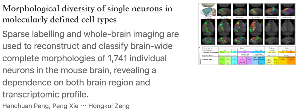 研究十一:Morphological diversity of single neurons in molecularly defined cell types。重构了皮层、屏状核、丘脑和纹状体上1741个神经元,鉴定了不同形状特征和基因表达特征的11种投射神经元类型,揭示了其细胞多样性。