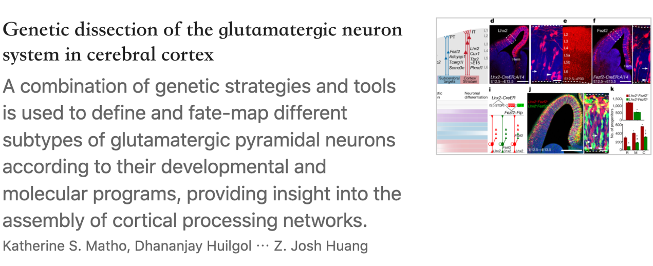 研究十二:Genetic dissection of the glutamatergic neuron system in cerebral cortex。通过构建多种可瞬时诱导的Cre Flp敲入小鼠,详细解析了锥体神经元不同亚群的命运图谱,揭示了锥体神经元的层级分化轨迹。