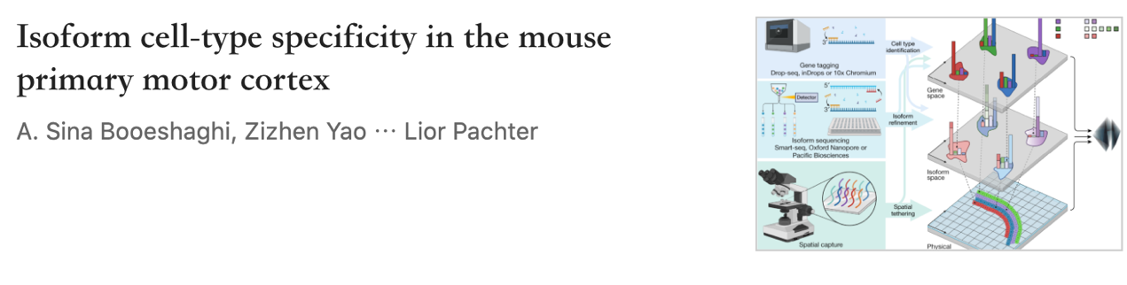 研究十三:soform cell-type specificity in the mouse primary motor cortex。该研究对小鼠初级运动皮层中6,160个细胞进行了SMART-Seq,280,327个细胞进行了MERFISH,94,162个细胞进行了10x Genomic单细胞测序,揭示了不同细胞类型中的同源异构体(isoform),以及其转变,揭示了同源异构体在鉴定细胞类型中的功能。