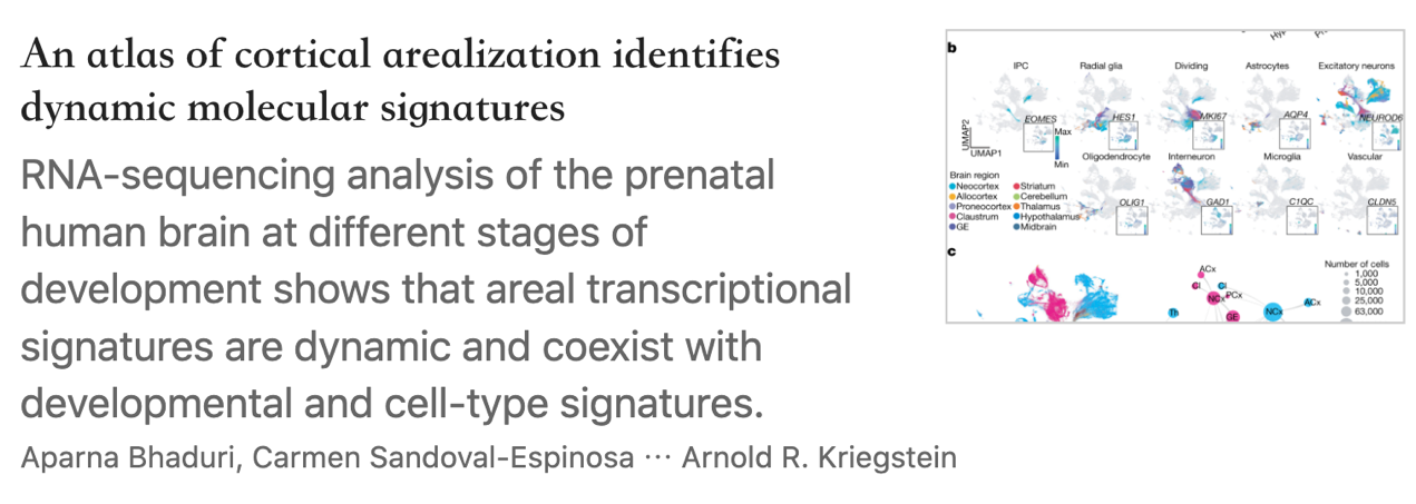 研究十四:An atlas of cortical arealization identifies dynamic molecular signatures。利用单细胞测序研究了神经发育和早期胶质生成阶段10个主要的脑区和6个新皮层区域,揭示了不同皮层区域不同细胞纵向发育的分子图谱。