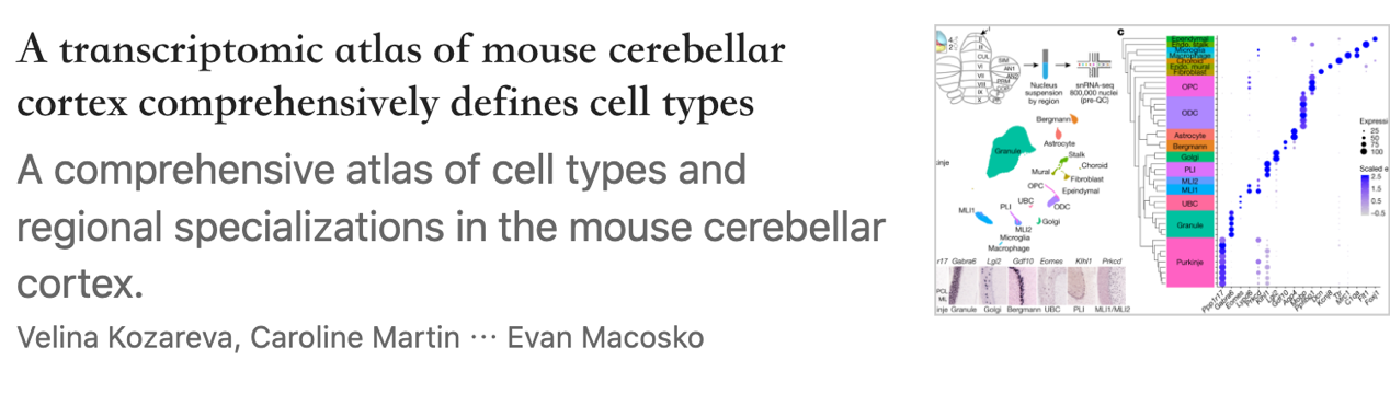 研究十六:A transcriptomic atlas of mouse cerebellar cortex comprehensively defines cell types.该研究利用高通量测序研究了小鼠小脑不同叶区不同细胞类型的分子图谱,揭示了不同细胞类型独特的分子特征,并将此特征与生理特征进行了联系。