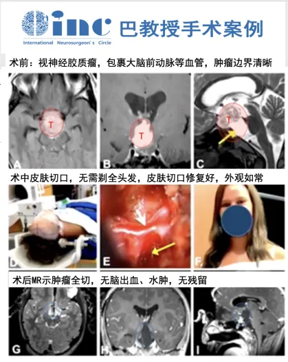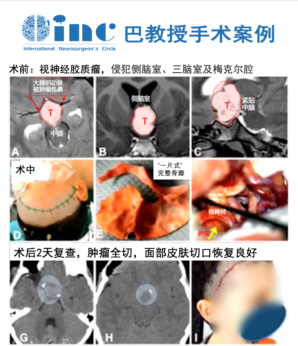 这个8岁的男孩因视路-下丘脑胶质瘤引起视力受损而就诊,这个肿瘤位于他的视路和下丘脑附近,甚至扩展到了第三脑室,并延伸至梅克尔腔(A-C)。术后早期CT扫描显示肿瘤完全切除,没有出现局部血肿(G、H)。患者没有出现额外的并发症,手术后的两周,医生拍摄了术后的照片,美容效果令人满意(I)。