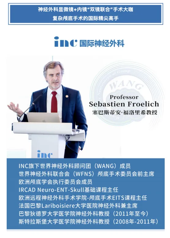 Froelich教授目前担任世界知名的神经外科医生组织世界神经外科联合会(WFNS)颅底手术委员会主席。他以神经内镜技术及显微神经外科手术极为见长,被国内外同仁誉为“世界神经内镜及颅底手术的天才教授”。目前,他也是INC国际神经外科医生集团旗下世界神经外科顾问团(WANG)的成员。