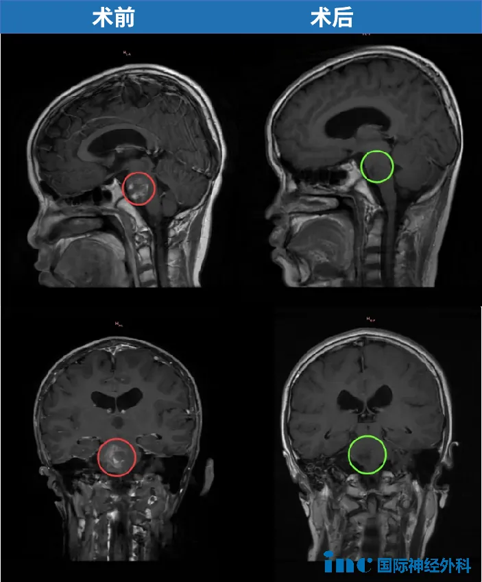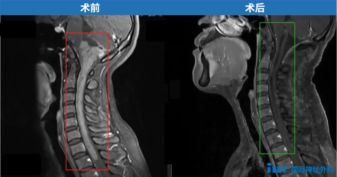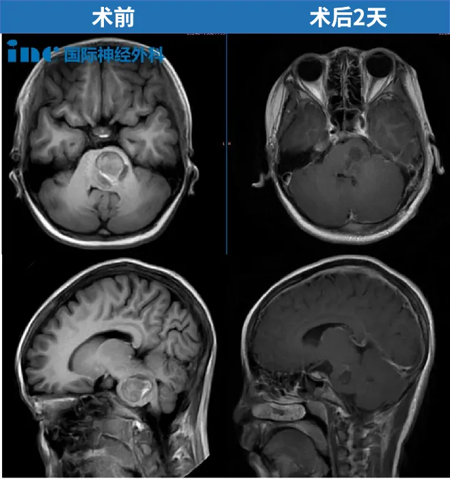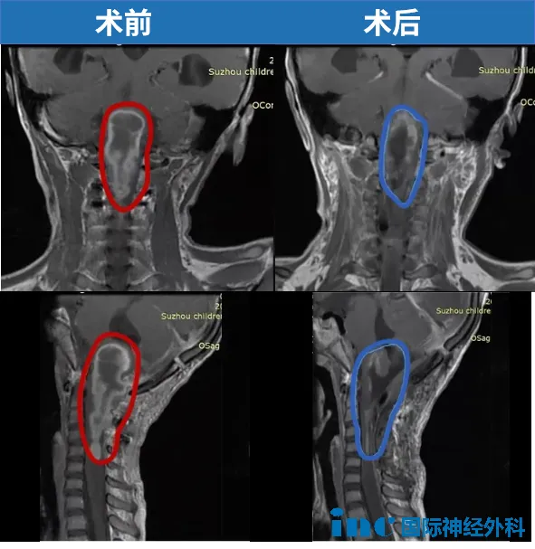 33岁,郑女士,15cm肿瘤起源于脑干下部,累及延髓和颅颈交界区,且向下方延伸到整个颈部脊髓以及一直到第一胸椎水平。2022年巴教授中国疑难示范手术,顺利近全切。