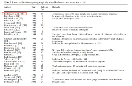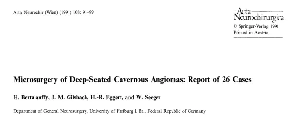 早在1991年,巴特朗菲教授就已发布过相关研究,《Microsurgery of Deep-Seated Cavernous Angiomas:Report of 26 Cases深部海绵状血管瘤的显微外科治疗(附26例报告)》,回顾了26例经显微手术切除的深部海绵状血管瘤,其中14个位于脑干内。这些患者是1983年8月至1989年12月间手术的患者。11例完全切除,没有产生额外的神经功能缺损。