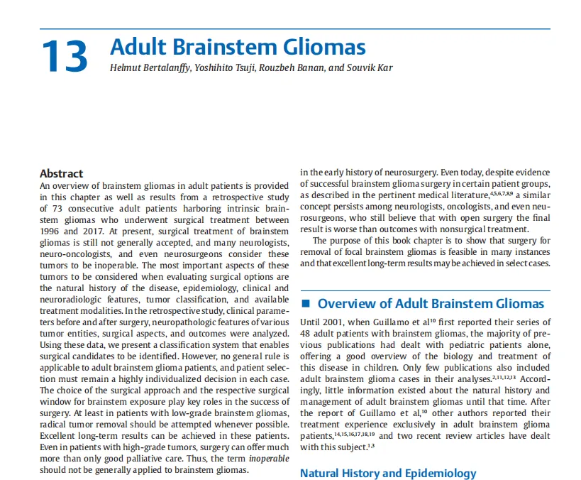 2020年新版的世界脑干手术专著《Surgery of the Brainstem》(脑干手术)中,巴特朗菲教授撰写的《adult brainstem glioma》(成人脑干胶质瘤)这一章节,回顾性研究了1996年至2017年间接受手术治疗的73例患有脑干神经胶质瘤的成年患者。重点详细阐述了脑干手术的技术要点、操作技巧、手术入路、手术体位等,已成为神经外科医生的学习典范。