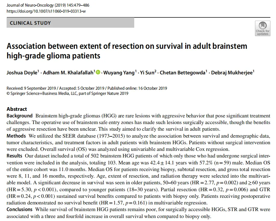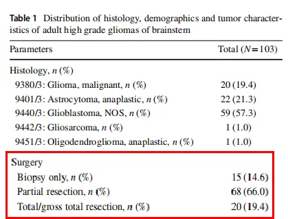 脑干胶质瘤往往高级别胶质瘤居多,你知道美国从1973-2015年高级别胶质瘤手术的(包括活检)有几例吗?40年103例,其中活检15例,真正手术的只有88例。数据来源——SEER数据库(The Surveillance,Epidemiology,and End Results),它由美国国立癌症研究所建立的常用的癌症数据库。