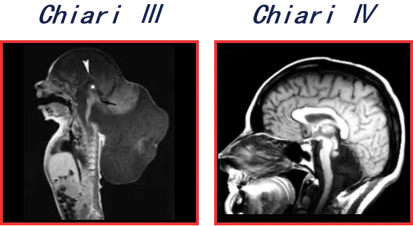 ▶▷Chiari III型(CIM-III):罕见的一种,主要表现为小脑组织由枕骨大孔向枕后膨出,严重者甚至可包括脑干及脑实质部分组织。