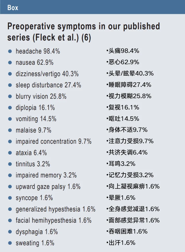 症状多样,诊断挑战。松果体囊肿之所以容易被忽视,核心是症状太“不典型”,该研究分享了常见术前症状: