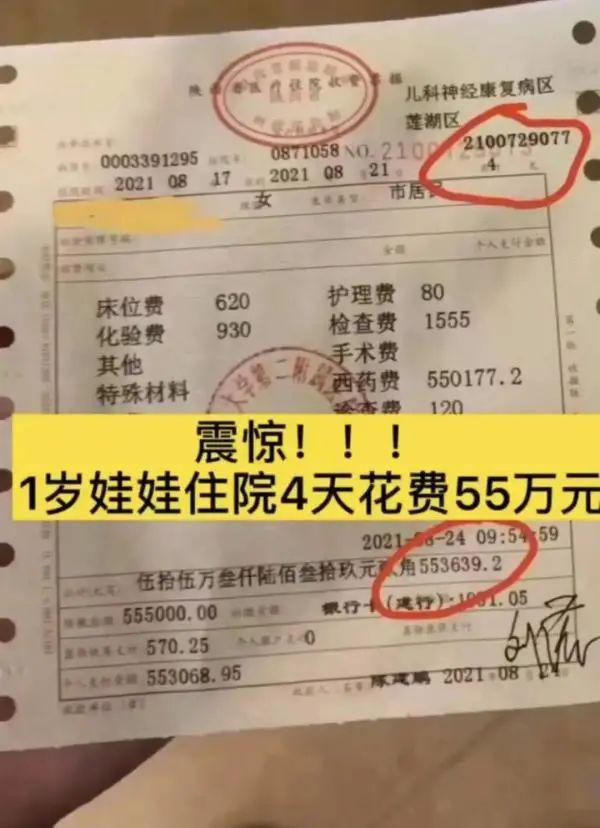 近日,西安交大二附属医院一张 55 万元的医院收费票据在网上引来关注。票据显示,一名 1 岁女娃从今年 8 月 17 日开始,住院 4 天直到 8 月 21 日,花费 55 万元。其中床位费 620 元,化验费 930 元,护理费 80 元,检查费 1555 元,诊查费 120 元,西药费 550177.2 元。